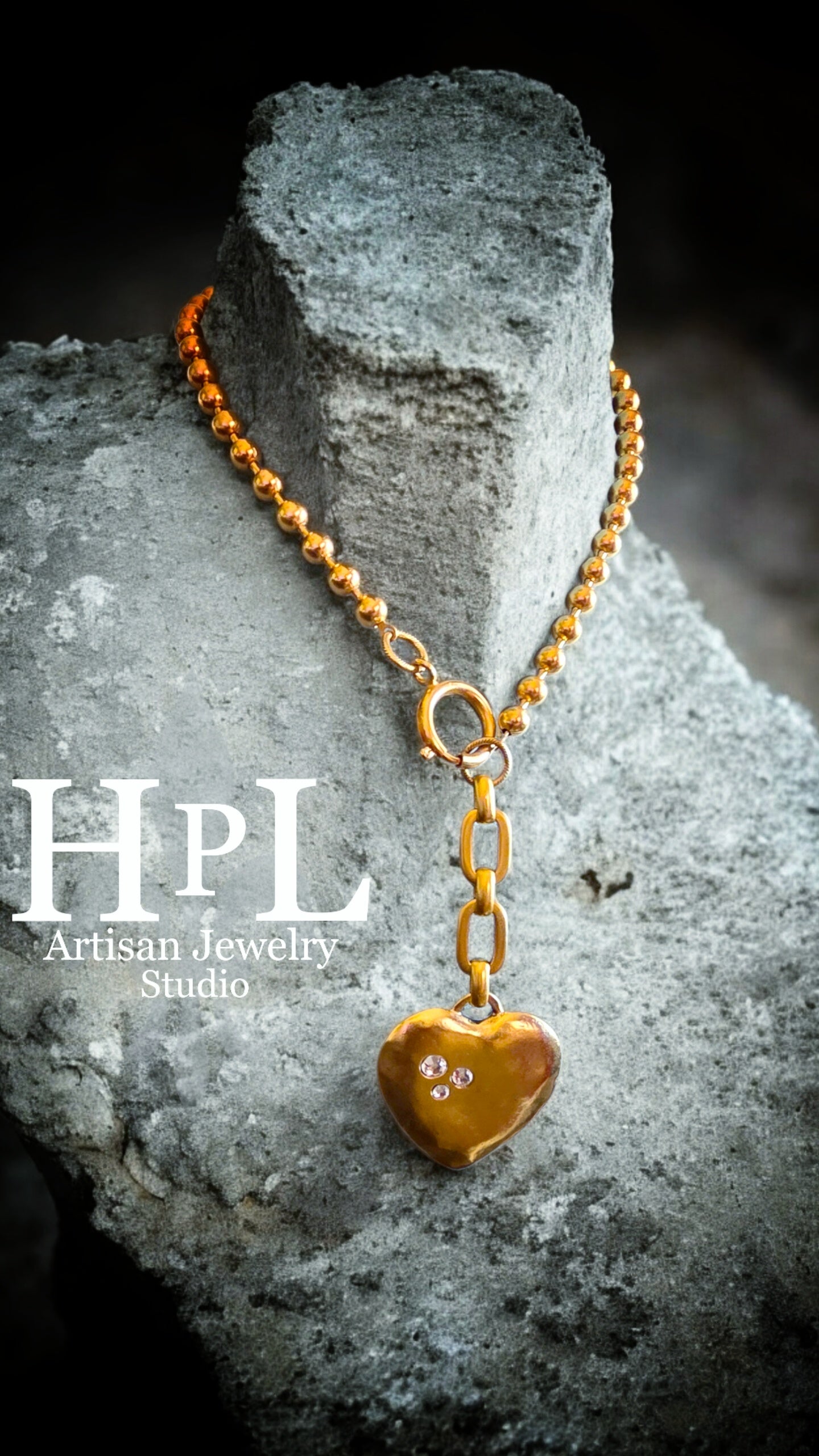 A golden heart pendant adorned with three delicate crystals, representing intention, alignment, and emotional rebirth.
