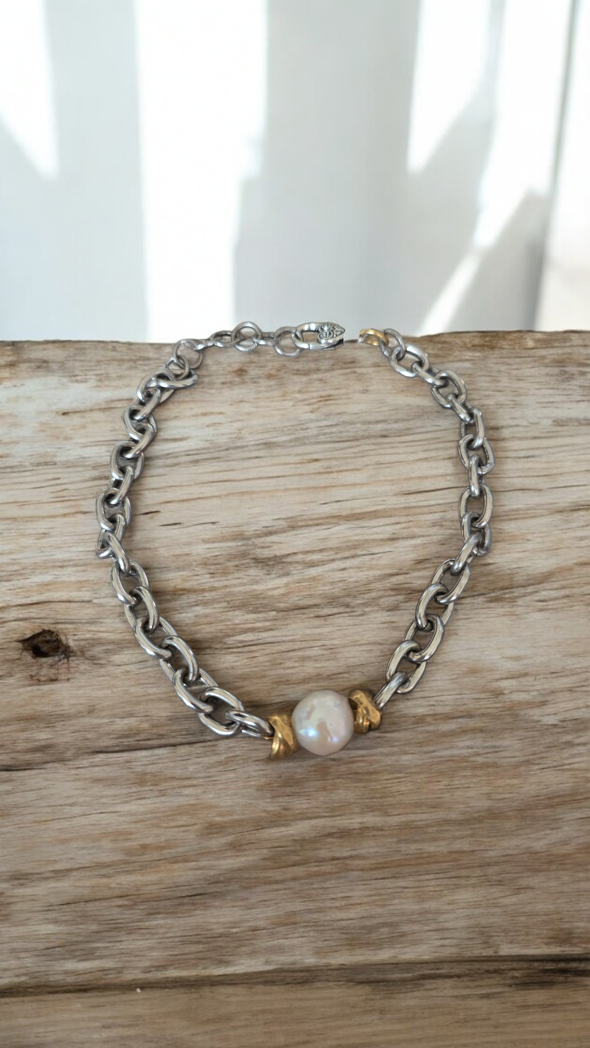 The strength of the chain represents resilience—the parts of you that hold everything together. The baroque pearl, imperfect and luminous, represents grace earned through experience.