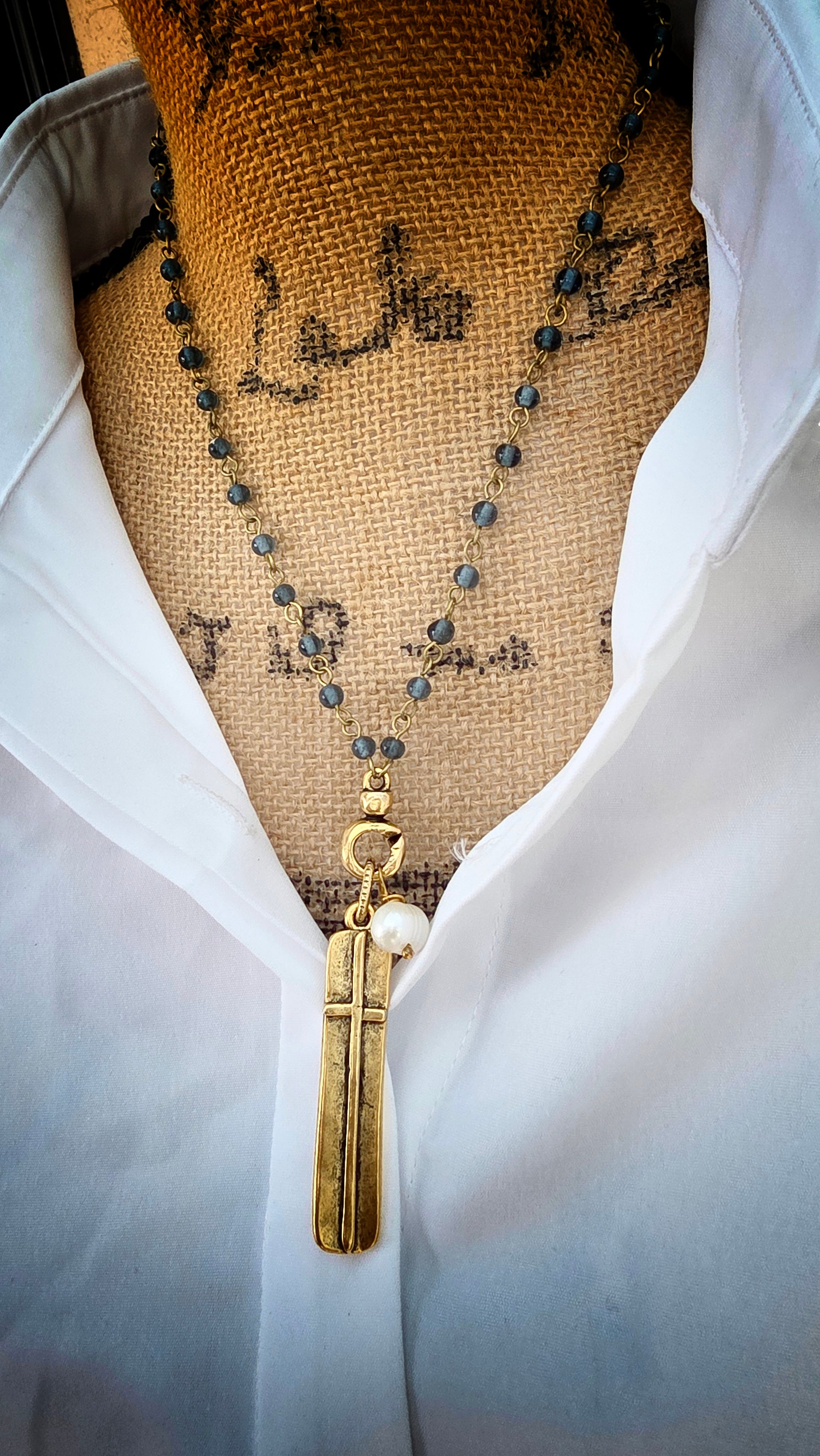 The Denim Glass & Pearl Cross Necklace is more than jewelry — it’s a statement of faith and resilience. The deep denim Czech glass beads reflect quiet strength, while the luminous pearl symbolizes wisdom and purity. At its heart hangs a golden cross, a timeless emblem of hope and divine protection.