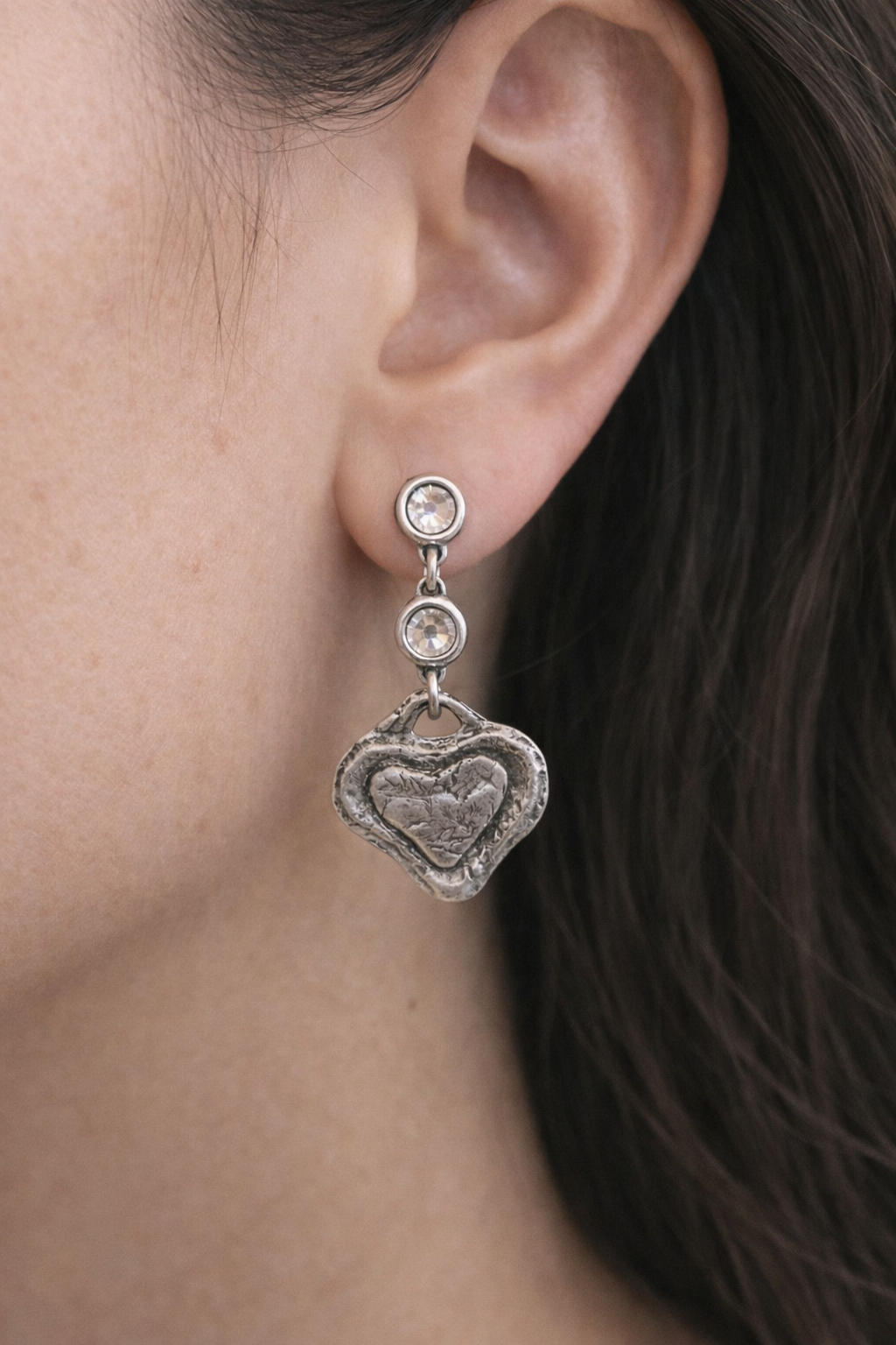 These silver-plated heart earrings are a quiet expression of devotion and light. Anchored by a luminous Swarovski crystal stud, each piece flows into a textured heart charm—imperfect, organic, and full of soul. The layered heart design reflects love shaped by experience: resilient, sacred, and beautifully real.