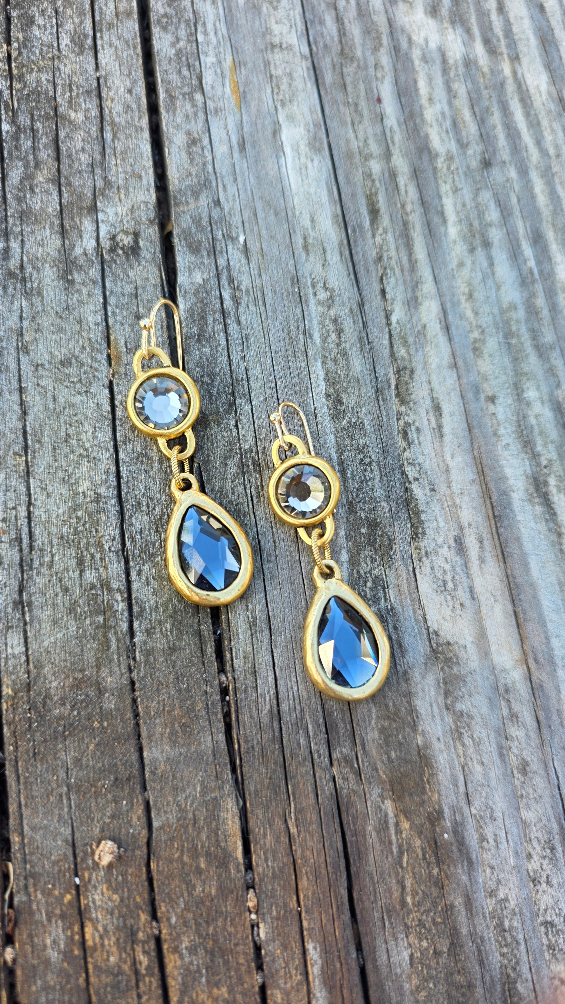 Featuring a brilliant round crystal connector paired with a faceted teardrop Swarovski drop, each piece is framed in antique-gold plating for a luxurious, timeless finish.